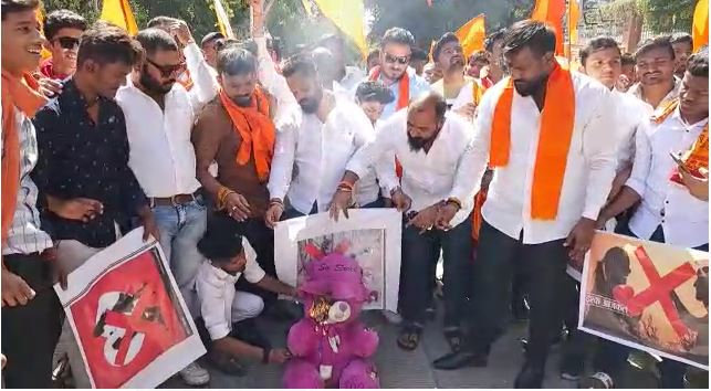 वैलेंटाइन डे पर बजरंग दल ने निकाली चेतावनी रैली, टेडीबियर जलाकर जताया विरोध